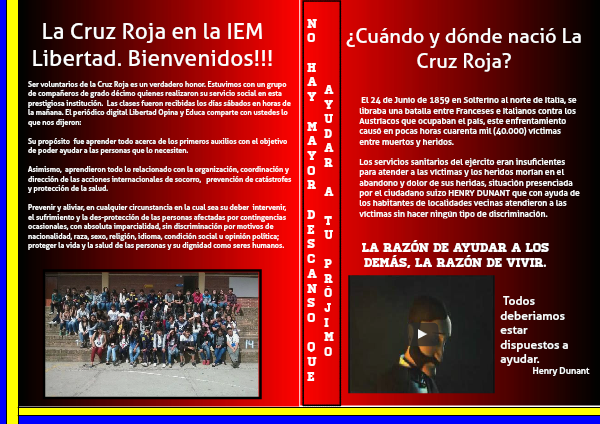 Ser voluntarios de la Cruz Roja es un verdadero honor. Estuvimos con un grupo de compañeros de grado décimo quienes realizaron su servicio social en esta prestigiosa institución. Las clases fueron recibidas los días sábados en horas de la mañana. El periódico digital Libertad Opina y Educa comparte con ustedes lo que nos dijeron: