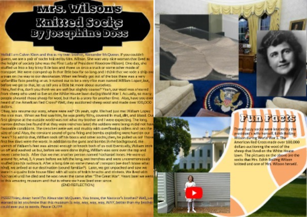 Hello ! I am Calvin Klein and this is my twin brother , Alexander McQueen . If you couldn ’ t guess , we are a pair of socks knitted by Mrs . Wilson . She was very nice woman that lived at the height of society ( she was the First Lady of President Woodrow Wilson ). One day , she stuffed us into a itsy bitsy little box and threw us onto a truck or some other mode of transport . We were cramped up in that little box for so long and I think that we rode a ship and a train on the way to our destination . When we finally got out of the box there was a very unfamiliar face peering at us . It turned out to be a very nice man named William Lopez , but , before we get to that , let us tell you a little bit more about ourselves . Here , feel this , don ’ t you think we are soft but slightly coarse ? Yeah , our wool was sheared from sheep who used to live on the White House lawn during World War 1 . Actually , so many people sheared those sheep for wool , but that is a story for another time . Also , have you ever heard of the American Red Cross ? Well , they auctioned sheep wool and made over 100,000 dollars . Okay , lets resume our story , where were we ? Oh yeah , right . We had just met William Lopez the nice man . When we first saw him , he was pretty filthy , covered in mud , dirt , and blood . Our first glimpse at the outside world was not what my brother and I were expecting . The long , narrow ditches ( we found that they were trenches later ) the soldiers were living in did not have favorable conditions . The trenches were wet and muddy with overflowing toilets and rats the size of cats ! Also , the constant sound of guns firing and bombs exploding were hard on our “ ears ”! To add to that , William took off his boots and other socks , then , he pulled us on ! Those first few days were the worst . In addition to the guns and bombs in the background , the stench of William ’ s feet was almost enough to knock both of us out ! Eventually , William took us off and washed us but , before we were done drying , William was sent over the top and never came back . After that we met another person named Nathaniel Jones . He wore us around for , what , 3 , 4 years before we left the long , wet trenches and were unceremoniously stuffed into his rucksack . After a long ride on some mean of transport ( we don ’ t know what kind ), we arrived at our destination ( sound familiar ?). Later , we got unpacked and saw we were in a quaint little house filled with all sorts of knick knacks and trinkets . We lived with Nathaniel until he died and he was never the same after “ The Great War ”. Years later we went to this amazing museum and that is where we have lived ever since .