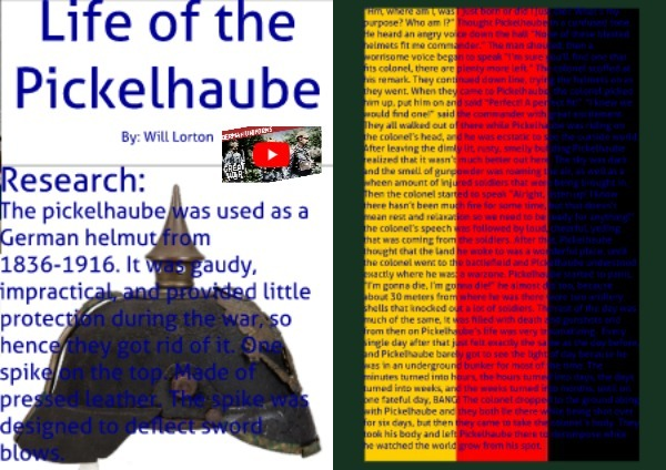 “ Hm , where am I , was I just born or did I just die ? What ’ s my purpose ? Who am I ?” Thought Pickelhaube in a confused tone . He heard an angry voice down the hall “ None of these blasted helmets fit me commander .” The man shouted , then a worrisome voice began to speak “ I ’ m sure you ’ ll find one that fits colonel , there are plenty more left .” The colonel scoffed at his remark . They continued down line , trying the helmets on as they went . When they came to Pickelhaube , the colonel picked him up , put him on and said “ Perfect ! A perfect fit !” “ I knew we would find one !” said the commander with great excitement . They all walked out of there while Pickelhaube was riding on the colonel ’ s head , and he was ecstatic to see the outside world . After leaving the dimly lit , rusty , smelly building Pickelhaube realized that it wasn ’ t much better out here . The sky was dark and the smell of gunpowder was roaming the air , as well as a wheen amount of injured soldiers that were being brought in . Then the colonel started to speak “ Alright , listen up ! I know there hasn ’ t been much fire for some time , but that doesn ’ t mean rest and relaxation so we need to be ready for anything !” the colonel ’ s speech was followed by loud , cheerful , yelling that was coming from the soldiers . After that , Pickelhaube thought that the land he woke to was a wonderful place , until the colonel went to the battlefield and Pickelhaube understood exactly where he was : a warzone . Pickelhaube started to panic , “ I ’ m gonna die , I ’ m gonna die !” he almost did too , because about 30 meters from where he was there were two artillery shells that knocked out a lot of soldiers . The rest of the day was much of the same , it was filled with death and gunshots and from then on Pickelhaube ’ s life was very traumatizing . Every single day after that just felt exactly the same as the day before , and Pickelhaube barely got to see the light of day because he was in an underground bunker for most of the time . The minutes turned into hours , the hours turned into days , the days turned into weeks , and the weeks turned into months , until on one fateful day , BANG ! The colonel dropped to the ground along with Pickelhaube and they both lie there while being shot over for six days , but then they came to take the colonel ’ s body . They took his body and left Pickelhaube there to decompose while he watched the world grow from his spot .