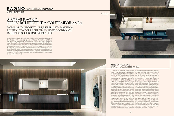 La linea Must presenta come sistema d ' arredo modulare pensato per showroom specializzati, progettisti e interior contractor che richiedono soluzioni complete e altamente versatili. La collezione integra materiali naturali, tecnologia costruttiva e comfort d’ uso offrendo configurazioni coerenti con il linguaggio dell’ architettura moderna. L ' ampia libertà compositiva, l ' e- sclusiva ricerca materica e l ' alta prestazione degli spazi interni rappresentano i principali caratteri distintivi dell’ intera collezione. Must combina marmi, onice e legni pregiati, tra cui Olmo ed Eucalipto termocotto, con superfici metalliche dall’ effetto ossidato, definendo un design in cui linee essenziali e matericità sofisticate generano uno spazio senza connotazioni temporali, capace di dialogare con contesti architettonici differenti. Il mobile sospeso, utilizzato come piano d’ appoggio per i lavabi e caratterizzato dall’ assenza di maniglie, interpreta una ricerca progettuale orientata all’ essenzialità e alla purezza formale. Nella versione con frontali in laccato Metal Acciaio Nuvolato, la scocca Sand Petrolio introduce un accostamento cromatico naturale e misurato che alleggerisce il volume e contribuisce alla definizione di un’ immagine attuale e raffinata. Il grande cestone integra un sistema tecnico di cassettiere progettato per garantire scorrevolezza, resistenza e un’ organizzazione funzionale degli spazi. La continuità della scocca Rosmarino anche negli interni rafforza la coerenza progettuale del sistema e sottolinea l’ attenzione al dettaglio, cifra caratteristica dell’ intera collezione. La composizione è completata dal doppio lavabo a semincasso in Marmo Paonazzetto che aggiunge una decisa presenza materica. Il bordo smussato a 30 ° introduce un segno preciso che valorizza la superficie del piano e conferisce all’ insieme una chiara definizione architettonica. La configurazione con doppio lavabo amplia la funzionalità dello spazio, risultando particolarmente adatta ad ambienti bagno di ampie dimensioni o ad uso condiviso, dove comfort e praticità diventano parte integrante dell’ esperienza quotidiana.