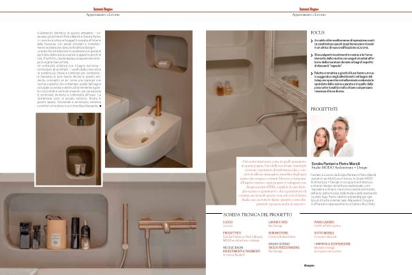 « L’ elemento distintivo di questo ambiente – osservano gli architetti Pietro Marsili e Sondra Pantani – sono le nicchie portaoggetti ricavate all ' interno della muratura, con angoli stondati e completamente resinate per dare profondità al design ». Lo specchio retroilluminato evidenzia con grazia le spatolate della resina creando suggestivi giochi di luce. A soffitto, una lampada a sospensione vintage di origine marocchina. « In continuità stilistica con il bagno del living – concludono gli architetti –, quello della zona notte ha tonalità più chiare e luminose per compensare l’ assenza di luce diurna. Anche in questo ambiente, concepito un po’ come una‘ capsule’ con nicchie a parete che richiamano quelle del bagno principale, la resina riveste uniformemente superfici orizzontali e verticali creando una sensazione di continuità materica e luminosità diffusa ». Le rubinetterie sono in acciaio satinato. Anche in questo spazio, funzionale e armonioso, estetica e comfort si fondono in un’ atmosfera rilassante.