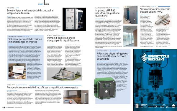 Pompe di calore ad anello d’ acqua per la riqualificazione www. ista. com ista Italia propone soluzioni per la misurazione e l’ analisi dei consumi volte a rendere trasparenti i flussi energetici negli edifici e a supportare la transizione verso una gestione più efficiente. La proposta comprende strumenti per la contabilizzazione individuale di calore e acqua, piattaforme digitali per il monitoraggio e servizi per la gestione dei dati energetici, pensati per contesti residenziali, commerciali e industriali. Tra le soluzioni presentate figurano HeatPilot, progettato per ottimizzare in tempo reale la gestione degli impianti termici; MinuteView, una piattaforma di monitoraggio che consente analisi e confronto dei consumi su più sedi; e i contatori sensonic 3, dispositivi di ultima generazione per la lettura dei consumi con trasmissione affidabile dei dati. Questi prodotti sono integrabili nelle piattaforme proprietarie ista Connect e ista Portale Impianti, che aggregano informazioni utili ai gestori per interventi di efficienza e alla compliance con obblighi normativi come la direttiva EED 2.0. L’ approccio di ista Italia facilita la trasformazione degli obblighi di misurazione in opportunità di risparmio economico e di miglioramento del comportamento degli utenti. La disponibilità di dati precisi e aggiornati rende possibili analisi puntuali dei consumi, la taratura di strategie di efficientamento e la gestione remota degli impianti, con vantaggi per proprietari, amministratori e occupanti. www. innova. it Innova amplia la gamma Water Loop Heat Pump( WLHP) con tre terminali in pompa di calore, estendendo le possibilità applicative di un sistema pensato per sostituire gli impianti tradizionali— a metano, gasolio o pellet— senza necessità di opere murarie. WLHP Ducted è progettato per l’ installazione a scomparsa nel controsoffitto, con possibilità di canalizzazione dell’ aria— soluzione indicata negli interventi di retrofit in edifici storici e di pregio. WLHP a Circuito Aperto funziona con acqua a perdere, ottimizzato per portate ridotte e ideale per data center, locali tecnici e ambienti ad alta continuità operativa, collegabile alla rete idrico-sanitaria o in configurazione con acqua di falda. WLHP per ACS è il modulo acqua / acqua per la produzione di acqua calda sanitaria su impianti ad anello chiuso: nel periodo estivo contribuisce al raffreddamento dell’ anello producendo ACS con recupero termico totale, con COP fino a 4,8. Tutte e tre le unità utilizzano il refrigerante naturale R290( GWP = 3), sono equipaggiate con compressore DC Inverter e ventilatori modulanti, e possono essere gestite tramite display touch, pannelli a parete serie M7 o sistema di supervisione Butler di Innova.