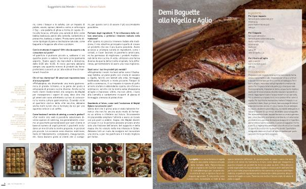 Preparare il pre-impasto la sera prima mescolando farina, acqua, pasta madre e sale. Impastare per circa 2-3 minuti e lasciare fermentare per 8-12 ore fino al raddoppio. Per il burro all’ aglio, mescolare tutti gli ingredienti e mettere da parte. Per l’ impasto, tenere da parte g 50 di acqua e sale. Successivamente, impastare le farine, acqua, lievito madre e lievito per 8 minuti a bassa velocità e lasciare riposare 8-10 minuti. Aggiungere il sale e l’ acqua restanti un po’ per volta, fino a ottenere un impasto liscio. Incorporare infine i semi di nigella. Per la prima fermentazione, mettere l’ impasto in un contenitore oliato. Dopo 30 minuti, fare una piega di rinforzo e lasciare lievitare ancora 1 / 1 ora e mezza, fino al raddoppio. In seguito, dividere in pezzi da g 275, formando delle palline, e lasciare riposare 30-40 minuti. Modellare i pezzi a baguette. Per la lievitazione finale, lasciare lievitare su un asciugamano per 1 ora e mezza / 2 a temperatura ambiente, o in alternativa procedere con una breve lievitazione da apporre in frigorifero per la cottura il giorno seguente. Cuocere le baguette in forno a 260 ° C su teglie preriscaldate per circa 18 minuti con l’ ausilio di vapore, fino a che non risulteranno dorate. Spennellare le baguette calde con il burro all’ aglio e rimettere per pochi secondi in forno per farlo sciogliere.