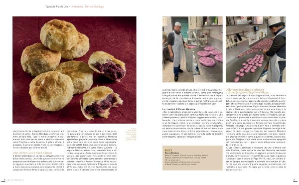 Il Maestro Mendoza ci spiega « L’ halayang ube è un dolce molto antico, una volta questa crema veniva preparata con ube lessato e schiacciato cui venivano aggiunti zucchero e latte di cocco, il tutto cotto a fuoco basso mescolando continuamente finché il composto diventa denso e appiccicoso, simile alla confettura. Oggi la crema di ube si trova pronta, preparata con polvere di ube e zucchero, latte condensato o burro, ma io » specifica Mendoza « preferisco prepararla ancora come si faceva una volta, con il latte di cocco come terzo ingrediente. Come la patata dolce, che noi chiamiamo kamote, indipendentemente da come viene cucinato – a vapore, lessato, schiacciato, macinato fino a ottenere una pasta – l’ ube mantiene il suo colore, in questo caso viola vivido. Può anche essere semplicemente utilizzato come estratto, aromatizza e colora » specifica Romeo Mendoza « Può succedere che in alcune parti delle Filippine e talvolta all’ Estero, l’ ube non si trovi facilmente: nel caso viene usato il kamote, che viene aromatizzato( e