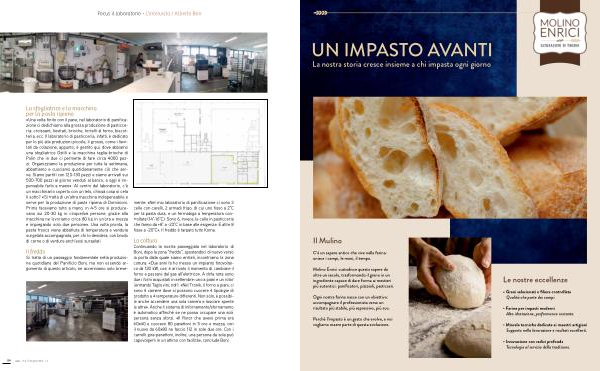 « Una volta finito con il pane, nel laboratorio di panificazione ci dedichiamo alla grossa produzione di pasticceria: croissant, lievitati, brioche, tortelli al forno, biscotteria, ecc. Il laboratorio di pasticceria, infatti, è dedicato per lo più alle produzioni piccole, il grosso, come i lievitati da colazione, appunto, è gestito qui, dove abbiamo una sfogliatrice Ostili e la macchina taglia-brioche di Polin che in due ci permette di fare circa 4000 pezzi. Organizziamo la produzione per tutta la settimana, abbattiamo e cuociamo quotidianamente ciò che serve. Siamo partiti con 120-130 pezzi e siamo arrivati sui 500-700 pezzi al giorno venduti al banco, a oggi è impensabile farlo a mano ». Al centro del laboratorio, c’ è un macchinario coperto con un telo, chissà cosa si cela lì sotto? « Si tratta di un’ altra macchina indispensabile e serve per la produzione di pasta ripiena di Dominioni. Prima facevamo tutto a mano, in 4-5 ore si producevano sui 20-30 kg in cinque / sei persone, grazie alla macchina ne lavoriamo circa 80 kg in un’ ora e mezza e impiegando solo due persone ». Una volta pronta, la pasta fresca viene abbattuta di temperatura e venduta surgelata accompagnata, per chi lo desidera, con brodo di carne o di verdure anch’ essi surgelati.