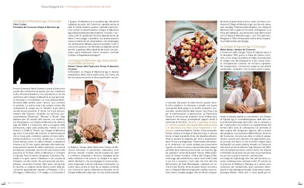 Fresco di nomina, Fabio Crestani ci porta sul territorio vocato alla coltivazione di questo succoso e delizioso frutto: « Il terreno basaltico, ricco di potassio, è ciò che conferisce alla Ciliegia di Marostica la sua particolare dolcezza e croccantezza. La croccantezza dipende anche dalla varietà, come i duroni, i più croccanti in assoluto. La nostra zona è da sempre vocata alla coltivazione di ciliegie con la“ Sandra”, la più antica varietà ancora presente. È anche tra le più precoci, insieme alle francesi, introdotte sul territorio successivamente,“ Bigarreau”,“ Moreau” e“ Burlat”. Oggi abbiamo ben 39 varietà tutte inserite, con modifica, nel disciplinare ». La Ciliegia di Marostica ha ottenuto l’ Igp nel 2002 e il Consorzio, oltre a occuparsi della promozione, vigila sulla produzione tramite un ente esterno, il CSQA di Thiene. « Le Ciliegie di Marostica Igp sono riconoscibili dal marchio di denominazione che si trova sulle confezioni insieme al nome dell’ a- zienda produttrice e al lotto. Quelle per il consumo fresco devono avere un calibro elevato, la pezzatura minima è di 23 mm; quelle destinate alla trasformazione possono essere di calibro inferiore ». La zona di produzione comprende i territori di nove Comuni nella provincia di Vicenza: « Oltre a Marostica si coltivano a Salcedo, Fara Vicentino, Breganze, Colceresa, Pianezze e in parte anche a Bassano e nel comune di Schiavon, con dei confini che sono precisati sul disciplinare », commenta Crestani. Ogni anno, nel periodo di raccolta, si svolgono anche diversi eventi dedicati. I prossimi appuntamenti saranno a Pianezze, il 23 e 24 maggio, a Marostica, il 31 maggio e a Colceresa il