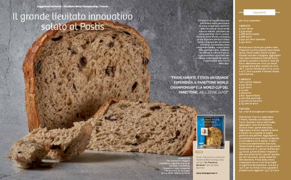 Chiarificare il burro e aggiungere il Pastis , facendo così evaporare l ’ alcol . Quando il burro sarà freddo , aggiungere i semi di finocchio e di anice tritati , quindi mescolare . Aggiungere al primo impasto la farina e mixare fino a quando la maglia glutinica sarà perfetta . Aggiungere in successione le uova , il burro preparato in precedenza con le spezie , il sale e le olive precedentemente essiccate . Tempo totale di impasto circa 45 minuti , temperatura 26 ° C . Lasciar lievitare per 45 minuti , quindi dividere l ’ impasto e dare una prima forma . Lasciar riposare per altri 25 minuti , quindi modellare delicatamente . Prima della cottura cospargere con un crust di acciughe la superficie del panettone . Cuocere a 150 ° C per 60 minuti o fino a quando il prodotto avrà raggiunto i 93 ° C al cuore . |
