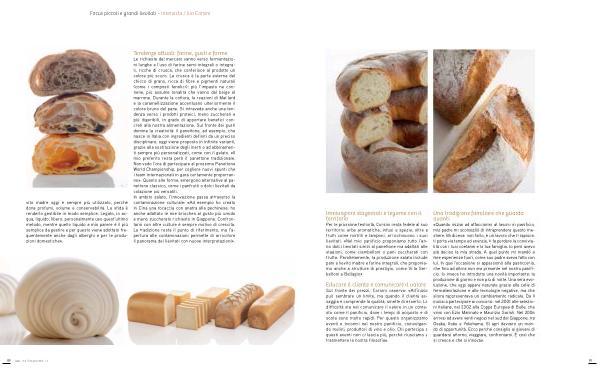 Le richieste del mercato vanno verso fermentazioni lunghe e l’ uso di farine semi-integrali o integrali, ricche di crusca, che conferisce al prodotto un colore più scuro. La crusca è la parte esterna del chicco di grano, ricca di fibre e pigmenti naturali( come i composti fenolici): più l’ impasto ne contiene, più assume tonalità che vanno dal beige al marrone. Durante la cottura, le reazioni di Maillard e la caramellizzazione accentuano ulteriormente il colore bruno del pane. Si intravede anche una tendenza verso i prodotti proteici, meno zuccherati e più digeribili, in grado di apportare benefici concreti alla nostra alimentazione. Sul fronte dei gusti domina la creatività: il panettone, ad esempio, che nasce in Italia con ingredienti definiti da un preciso disciplinare, oggi viene proposto in infinite varianti, grazie alla sostituzione degli inerti o ad abbinamenti sempre più personalizzati, come con il gelato. « Il mio preferito resta però il panettone tradizionale. Non vedo l’ ora di partecipare al prossimo Panettone World Championship, per cogliere nuovi spunti che i team internazionali in gara certamente proporranno ». Quanto alle forme, emergono alternative al panettone classico, come i panfrutti o dolci lievitati da colazione più versatili. In ambito salato, l’ innovazione passa attraverso la contaminazione culturale: « Ad esempio ho creato in Cina una focaccia con anatra alla pechinese; ho anche adattato le mie brioches al gusto più umido e meno zuccherato richiesto in Giappone. Confrontarsi con altre culture è sempre motivo di crescita. La tradizione resta il punto di riferimento, ma l’ a- pertura alle contaminazioni permette di arricchire il panorama dei lievitati con nuove interpretazioni ».
