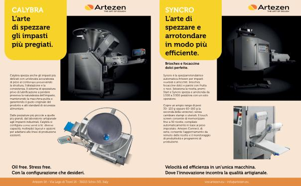 Copre un ampio range di pesi: 30- 120 g oppure 60 – 160 g( a seconda della versione), senza cambiare stampi o utensili. Il touch screen consente di memorizzare fino a 50 ricette, compilate automaticamente in base al peso impostato. Artezen Connect, di serie, consente l’ aggiornamento da remoto delle ricette e il monitoraggio di produttività e programmi di produzione.