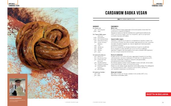 Farcia al cardamomo Fondere olio di cocco e burro di cacao, aggiungere le spezie e lo zucchero ed emulsionare. Lasciare cristallizzare in frigorifero o in abbattitore a 4 ° C. Una volta cristallizzato, stendere il composto sulla pasta babka precedentemente stesa e raffreddata. Arrotolarla, tagliare a metà il rotolo di babka in senso verticale, intrecciando le due metà tenendo il taglio con la farcitura a vista. Disporre in uno stampo tondo seguendo il verso dello stampo. Far raddoppiare in cella di lievitazione a 28 ° C. Cuocere in forno a 160 ° C, ventola a 3, con l’ umidità in camera per circa 25 minuti.