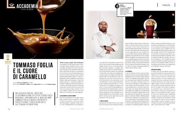 LA TECNICA Come ci sei arrivato ? « È stato un lavoro di fino partendo da una ricetta di caramello abbastanza standard , pari peso zucchero e panna ; all ’ inizio ottenevo un caramello molto liquido , che risultava di un gusto troppo blando , il che vanificava il lavoro . Con il tempo , lavorandoci un po ’, ho trovato la mia ricetta ideale , con la consistenza , il colore , il gusto e il punto di sale giusto – ricordo che il caramello mou è conosciuto come il caramello salato . Sono arrivato alla soluzione ideale per mantenere un equilibrio tra la caramellosità del mou e la necessità di congelare il dolce : sostituire nella ricetta del caramello mou una parte di panna con una parte di latte : la diminuita quantità di zuccheri è sufficiente a far congelare il prodotto , permettendone la lavorabilità durante la produzione – parlando da professionista , la chiave di forza sta nel realizzare dei prodotti che siano belli ma anche fattibili . Togliendo nella ricetta del mou questa piccola parte di grassi e sostituendola con del liquido , ho trovato la quadra ». Ci sono delle percentuali precise da rispettare per mantenere questo equilibrio ? « Ho visto che la quantità ideale di panna da sostituire con latte in ricetta va dal 10 al 15 %». Strumentazione particolare ? « Una pentola , una frusta e tanta , tanta pazienza » Tommaso Foglia ride . « Verso il caramello modificato in stampi in silicone a sfera e lo abbatto a – 40 ° C ». Quando usi questa tecnica ? « Principalmente nelle monoporzioni , la struttura non ne permette l ’ utilizzo in una torta moderna perché l ’ inserto non reggerebbe il peso della parte superiore della torta ».