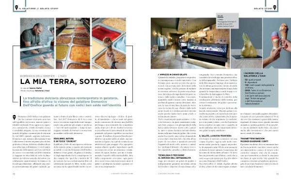L’ ABRUZZO IN CHIAVE GELATO « Quando ho iniziato, proponevo un prodotto contemporaneo e molto innovativo. Con il tempo, però, mi sono accorto che i giovani non conoscevano più i dolci tipici della nostra regione, così ho pensato di tradurre in versione sottozero la pasticceria abruzzese, fatta da pochi ingredienti dal gusto intenso e dalle radici contadine ». Cioccolato, mandorle, miele e mosto cotto, insieme ai profumi di agrumi e spezie diventano, dunque, la base di una linea di gusti che rievocano la cucina di casa. « Partire dalla tradizione locale si è rivelata un’ idea vincente anche perché siamo stati i primi a farlo, e nel momento giusto ». Tra le creazioni più rappresentative c’ è Nevola Sottozero, un gusto amatissimo realizzato base acqua e con gli ingredienti della tipica cialda ortonese: mosto cotto, cannella, anice e pasta d’ arancia lavorati direttamente nella macchina del gelato. Ma ci sono anche bocconotto, una cestino di mandorle e cioccolato; il mostacciolo, che oltre all’ impasto di cioccolato e mandorle prevede l’ aggiunta di mosto cotto, arancio e cannella e“ profumi d’ Abruzzo” che unisce cioccolato, mandorla, cannella e cubetti d’ arancio.