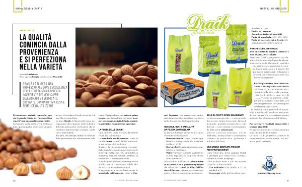 UNA GAMMA COMPLETA PENSATA PER I PROFESSIONISTI Ogni referenza della gamma Draik è calibrata per offrire resa costante, stabilità e facilità d’ impiego. Oltre ai frutti interi e alle lavorazioni classiche, la linea include:- Uva sultanina( sia jumbo n. 11 sia standard n. 9)- Cocco rapé ideale per biscotteria e prodotti finiti al cocco- Farina di castagne- Granella e farina di arachidi- Paste di mandorla( 50 %, 33 %, 10 %)- Pasta di nocciole extra Draik, ottenuta da nocciole intere naturali