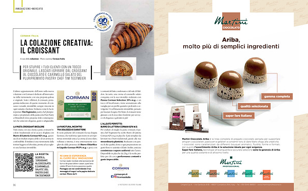 i contrasti del latte condensato e del sale di Maldon. Accanto, una crema al caramello salato conquista con la sua rotondità: realizzato con Panna Corman Selection 35 % m. g. e un tocco di bicarbonato, viene aromatizzato alla vaniglia per un profilo gustativo profondo e avvolgente. Un abbinamento irresistibile, pensato per lasciare il segno. Per finire, il croissant viene glassato con il cioccolato fondente per un tocco di eleganza e golosità in più!