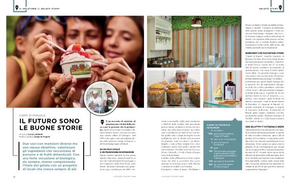 INGREDIENTI CHE RACCONTANO STORIE “ Campi di fragole ”, marchio registrato in Europa e in Cina , deve il suo nome ad uno dei brani più famosi dei Beatles , “ Strawberry fields forever ”, « uscito nel ‘ 67 , la nostra data di nascita , restituisce un momento di spensieratezza , così come il nostro gelato vuole offrire . Un prodotto biologico come concezione , che racconta storie di persone , di frutti dimenticati » prosegue Occhialini . L ’ attenzione per questi aspetti emerge dalle passioni che gli imprenditori ripongono nelle loro azioni quotidiane , aderendo a Slow food o alla associazione romagnola Tempi di Recupero . A parlare di ciò che mettono dentro le loro 27 proposte , a rotazione , sono proprio i gusti proposti nei banchi a pozzetto , come la menta bianca di Pancalieri . O i marroni di Marradi , l ’ a- rachide Venturina di Viareggio , le fragole di Scacciano di Riccione . Il pistacchio di Bronte , gusto vegano , realizzato con farina di piselli e patate . Il limone biologico di Verdello . « Anche se c ’ è fila il gusti vengono raccontati al cliente ».