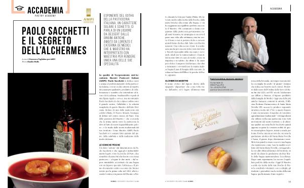 In qualità di Vicepresidente dell ’ Accademia Maestri Pasticceri Italiani ( AMPI ), Paolo Sacchetti si dedica cuore e anima al perfezionamento della pasticceria italiana , con un occhio attento al rispetto dei parametri qualitativi , produttivi , di collaborazione e scambio che sottendono al lavoro di Accademia . Sembrerebbe si parli di una figura rigida e severa , ma incontrando Paolo Sacchetti ciò che colpisce subito sono il grande sorriso , l ’ affabilità e la schietta semplicità di questo Maestro dell ’ Arte Dolciaria , titolare di una delle pasticcerie più celebri d ’ Italia , Il Nuovo Mondo , boutique di delizie nel centro storico di Prato . Una delle passioni del Maestro – che ci ricorda che la prima spinta verso la pasticceria la deve al fatto di essere inguaribilmente goloso – è lo studio delle ricette tradizionali del suo territorio . Come Maestro AMPI , Paolo Sacchetti si è sempre fatto garante del gusto , della salubrità e della tradizione delle ricette dolciarie .