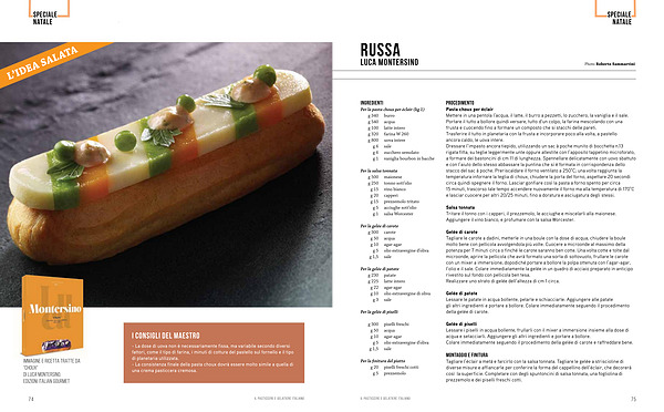 MONTAGGIO E FINITURA Tagliare l’ éclair a metà e farcirlo con la salsa tonnata. Tagliare le gelée a striscioline di diverse misure e affiancarle per conferire la forma del cappellino dell’ éclair, che decorerà così la superficie. Completare con degli spuntoncini di salsa tonnata, una fogliolina di prezzemolo e dei piselli freschi cotti. il pasticcere e gelatiere italiano