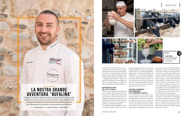 OPPORTUNITÀ E SFIDE DEL LATTE DI BUFALA « Il dolce che più ci rappresenta è la granita di ricotta con capperi canditi », spiega Cortese, che a Tenuta Anasita si esprime « liberamente usando materie prime eccellenti e prodotti a km zero ». L’ esperienza internazionale maturata tra Londra, l’ Italia e la Normandia e affinata alla scuola Hangar 78 gli ha permesso di comprendere a fondo le potenzialità del latte bufalino. « Le caratteristiche del latte di bufala sono il basso contenuto di lattosio, il gusto intenso e la maggiore percentuale di grasso, che consente di ridurre quelli di burro e panna, ottenendo un gusto più intenso e un prodotto più digeribile », spiega il pasticcere. A fronte della maggiore digeribilità, però, c’ è una lavorazione quotidiana complessa: « La freschezza del latte e della ricotta è la prima difficoltà perché il prodotto è diverso di giorno in giorno: bisogna sempre ribilanciare le ricette per standardizzare il prodotto finito. In pratica non esiste una ricetta unica: ogni giorno è una ricetta nuova ».