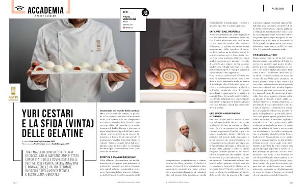 ISPIRAZIONI D’ AUTORE « Dopo lunghe ricerche, mi ha dato soddisfazione creare tante gelatine di frutta, tra cui tre che produco ogni giorno in laboratorio: pesca e vaniglia, lampone ed esotica. Sono molto interessanti anche mela verde e lime – la fibrosità della mela dà un effetto cremoso e il lime, sia succo sia scorza, dà una bella parte aromatica. In alcune gelatine metto a fine cottura del cioccolato: ne ho realizzata una di passion fruit e cioccolato al latte, un’ altra di purea di mango e gianduja, con pasta di nocciole e massa di cacao. In questi casi, il cioccolato fuso viene inserito a termine cottura, quando il prodotto è molto caldo, per ottenere una vera e propria emulsione. La percentuale di cioccolato ideale è tra l’ 8 e il 12 % al massimo, altrimenti non avremmo un’ emulsione efficace tra la parte‘ liquida’ della gelatina e i grassi della massa ». Una volta pronte queste gelatine? « Posso colarle in cornice, in un frame, tagliarle e rivestirle di zucchero; posso usarle nella pralineria, creando doppi strati: un primo strato di gelatina di frutta e un secondo con un cremino al cioccolato o una ganache; si andranno a fondere molto bene a livello anche di consistenza. Le ho anche ricoperte di marshmallow. Le mie gelatine di frutta possono essere usate come inserimenti in prodotti da forno, perché con questa tipologia di pectina a valore 70-72 Brix abbiamo un prodotto che una volta riscaldato non perde la sua struttura. So che alcuni colleghi le usano tagliate a cubettini all’ interno di grandi lievitati, insieme ai canditi e le gocce di cioccolato, oppure nei cake, nelle brioche, nei cornetti. Adesso sto lavorando per all’ abbinamento tra puree di frutta e infusioni con fiori ed erbe aromatiche » conclude il maestro. il pasticcere e gelatiere italiano