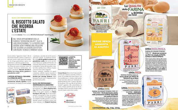 ELLE & VIRE PROFESSIONNEL ®: INDISPENSABILE IN LABORATORIO Alla base di questa ricetta, c’ è l’ impasto salato realizzato con il Burro Multiuso 82 % m. g. Elle & Vire Professionnel ®, che conferisce il suo gusto autentico. La Panna Excellence 35 % m. g. Elle & Vire Professionnel ®, incorporata in fase di emulsione, dona rotondità e il Parmigiano Reggiano completa il profilo gustativo con la sua intensità umami. La farcitura è invece una crema realizzata con Original American