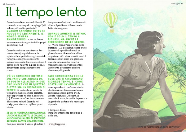 Quando aumenti il ritmo, non è solo il tempo a ridursi, ma anche la percezione dello spazio. [...] Viene meno l'esperienza della distanza. [...] Se quello stesso tratto lo percorri a piedi e ci metti un giorno invece di mezz'ora, allora respiri con più calma, ascolti, senti il terreno sotto i piedi e la giornata diventa tutta un'altra cosa. La montagna cresce gradualmentee l'ambiente circostante sembra diventare più grande.