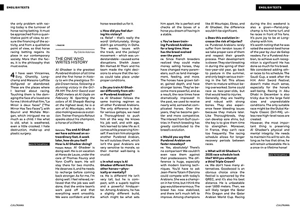 F . R . We don ’ t have many alternatives . Goodwood is an obvious choice since the festival is sponsored by the QREC , and it ’ s also his best distance . He is unbeatable over 1,600 meters . Then , we will likely target the Qatar Prix Dragon and the Qatar Arabian World Cup . Racing during the Arc weekend is also a given — ParisLongchamp is his home turf , and he races in front of his fans . It ’ s pure joy to be at Longchamp with him . It ’ s worth noting that he was voted the second-best horse of the year by Jour de Galop readers . For a Purebred Arabian , to achieve such recognition is significant ! He has done so much for his breed . We considered adding other races to his schedule . The Saudi Cup , a week after the H . H . Amir Sword Festival , doesn ’ t make much sense , especially for the horse ’ s well-being . Racing in Abu Dhabi in December is also tricky due to the large field sizes and unpredictable conditions . The only suitable race might be the Dubai Kahayla Classic ( Gr . 1-PA ), unless new high-level races are created . However , the most important thing is preserving Al Ghadeer ’ s physical and mental integrity . He needs to maintain his will to win . As long as he has that drive , he will remain unbeatable . He is a once-in-a-lifetime horse !