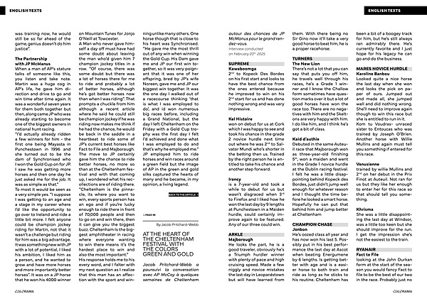 The Partnership with JP McManus When a man of AP ’ s stature talks of someone like this , you listen and take note . Martin was a huge cog in AP ’ s life , he gave him direction and drive to go and win time after time again . It was a wonderful seven years for them both together but then , along came JP who was already starting to become one of the biggest owners in national hunt racing . “ I ’ d actually already ridden a few winners for him - the first one being Mayasta in Punchestown in 1996 and she turned out to be the dam of Synchronised who I won the Gold Cup on for JP . I saw he was getting more horses and then one day he just asked me for the job . It was as simple as that .” To most it would be seen as a very simple yes . “ I suppose I was getting to an age and a stage in my career where I ’ d like the opportunity to go over to Ireland and ride a little bit more . I felt anyone could be champion jockey riding for Martin , not that it wasn ’ t a challenge but riding for him was a big advantage . It was something new with JP with a lot of potential , I liked his ambition , I liked him as a person , and he wanted to grow and have more horses and more importantly better horses ”. It was on a JP horse that he won his 4000 winner on Mountain Tunes for Jonjo O ’ Neill at Towcester . A Man who never gave himself a day off must have had some doubt about leaving the man who ’ d given him 7 champion jockey titles in a row . “ Of course , there was some doubt but there was a lot of horses there for me to ride and probably a lot of better horses , although he ’ s got better horses now than when I was riding ”. That prompts a chuckle from him although a recent article where he said he could still be champion jockey if he was riding now makes me think if he had the chance , he would be back in the saddle in a heartbeat to ride some of JP ’ s current best horses like Fact to File and Majborough . The move to JP certainly gave him the chance to ride better horses , no more so than at the Cheltenham festival and with that coming up , I wondered what his recollections are of riding there . “ Cheltenham is the pinnacle , its where you want to win , every sports person has an ego and if you ’ re lucky enough to ride there in front of 70,000 people and then to go on and win there , then it can give you the biggest buzz . Cheltenham Is the biggest amphitheater in racing where everyone wanting to win there means it ’ s the hardest place to win and also the most important .” His response holds me to his every word , and I falter with my next question as I realize that this man has an affection with the sport and win- ning unlike many others . One horse though that is close to his heart was Synchronised . ” He gave me the most thrill out of any win when winning the Gold Cup . His Dam gave me and JP our first win together , so it was very poignant that it was one of her offspring , bred by JP ’ s wife Noreen , gave me and JP our biggest win together . It was the one day I walked out of a racecourse thinking ‘ that is what I was employed to do ’, and id won numerous big races before , including a Grand National , but the day I left Cheltenham on the Friday with a Gold Cup trophy was the first day I felt I ’ d achieved and done what I was employed to do and that ’ s why he employed me .” JP employed him to ride horses and win races around a green field but the image of AP in the green and gold silks captured the hearts of many and he became , in my opinion , a living legend .