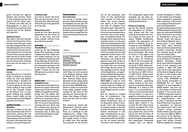 Prices are soaring During the March Festival , the population of Cheltenham triples and this has nothing to do with the mineral waters of this town of about 115,000 inhabitants , roughly the population of Rouen or Orléans . So it increases to over 300,000 for a week . A challenge for the municipality , and a boon for local businesses ! The price of rooms in the region , and up to tens of kilometres away , soars . It ’ s Christmas in March for this pretty Regency-style town ( early 19 th century ). A 2023 study estimated the economic impact of the Cheltenham Festival on the town at £ 274 million , or € 316 million . Seven years earlier , a first estimate put the figure at £ 100 million ... This extreme popularity makes access to the racecourse a headache because , although it is close to the town , it is surrounded by a rather rural environment and narrow roads . In a way , it ’ s a gigantic roundabout around a racecourse and woe betide anyone who misses their entrance gate : they ’ re in for a loop ! On the other hand , driving up Cleeve Hill in the evening , where you can enjoy a panoramic view of the whole site and the town of Cheltenham , before gliding down the other side towards the magnificent Cotswolds villages such as Winch- combe , Broadway or Stowon-the-Wold , is an unforgettable experience , especially after spending a few hours in a crowd as lively and compact as Cheltenham ’ s . So we ’ re talking about nearly 70,000 people a day for four days . An estimated 265,000 pints of Guinness are drunk at Cheltenham during the festival . That ’ s the equivalent of three Olympic swimming pools . If you added the many other alcohols , beers and wines ( sometimes mulled ) consumed during the meeting , you ’ d be talking more about lakes . In its current form , this festival is not that old . The Queen Mother Champion Chase ( Gr . 1 ), one of the five flagship races of the meeting , was created in 1959 . The Gold Cup , which is the equivalent of the Grand Steeple-Chase de Paris , is the richest race of the season at the racecourse , with € 755,000 in prize money ( compared to € 900,000 for our “ Grand Steeple ”). It was originally a 4,000-meters flat race run on the slopes of Cleeve Hill . Created in its current form in 1924 to meet the need for a major weight-for-age race for steeplechasers , rather than a handicap like the Grand National , it has grown in reputation to become the most crucial race in the “ Classic ” jumps calendar . Golden Miller won five years in a row from 1932 to 1936 in the colours of the flamboyant Dorothy Paget . Then the great Irish trainer Vincent O ’ Brien saddled his Cottage