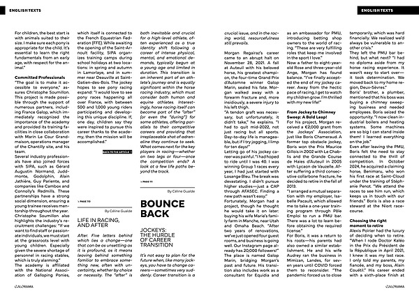 Morgan Regairaz ’ s career came to an abrupt halt on November 28 , 2021 . A fall at Auteuil with his beloved horse , his greatest champion , the four-time Grand Prix d ’ Automne winner Galop Marin , sealed his fate . Morgan walked away with a forearm fracture and , more insidiously , a severe injury to his left thigh . “ A tendon graft was necessary , but unfortunately , it didn ’ t take ,” he explains . “ I had to quit mid-2022 , not just racing but all sports . Day-to-day life is manageable , but if I try jogging , I limp for ten days !” Letting go of his jockey career was painful . “ I had hoped to ride until I was 40 . I was winning Group 1 races every year , I had just started with Losange Bleu . The break was devastating . I didn ’ t pursue higher studies — just a CAP through AFASEC . Finding a new path wasn ’ t easy .” Fortunately , Morgan had a project , though he thought he would take it on later : buying his wife Marie ’ s family farm in Manche , near Utah and Omaha Beach . “ After two years of renovations , we ’ ve just opened four guest rooms , and business is going well . Our Instagram page already has 20,000 followers !” The place is named Galop Marin , bridging Morgan ’ s past and future . His transition also includes work as a consultant for Equidia and as an ambassador for PMU , introducing betting shop owners to the world of racing . “ These are very fulfilling roles that keep me involved in the sport I love .” Now a father to eight-yearold Rose and three-year-old Ange , Morgan has found balance . “ I ’ ve finally accepted the end of my jockey career . Away from the hectic pace of racing , I get to watch my children grow . I ’ m thrilled with my new life !”