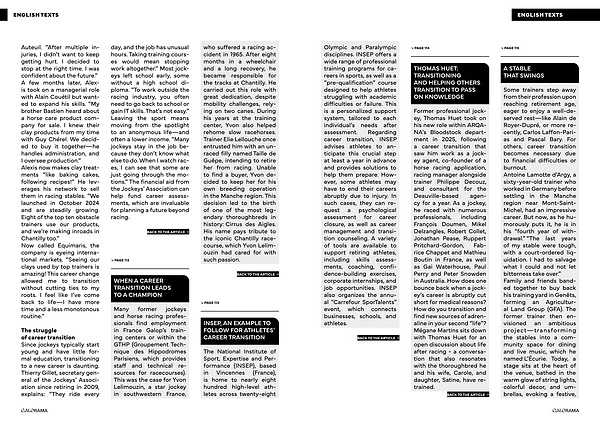 The struggle of career transition Since jockeys typically start young and have little formal education , transitioning to a new career is daunting . Thierry Gillet , secretary general of the Jockeys ’ Association since retiring in 2009 , explains : “ They ride every day , and the job has unusual hours . Taking training courses would mean stopping work altogether .” Most jockeys left school early , some without a high school diploma . “ To work outside the racing industry , you often need to go back to school or gain IT skills . That ’ s not easy .” Leaving the sport means moving from the spotlight to an anonymous life — and often a lower income . “ Many jockeys stay in the job because they don ’ t know what else to do . When I watch races , I can see that some are just going through the motions .” The financial aid from the Jockeys ’ Association can help fund career assessments , which are invaluable for planning a future beyond racing .