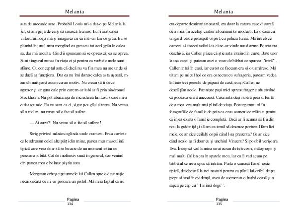 asta de mecanic auto. Probabil Louis mi-a dat-o pe Melania la fel, să am grijă de ea şi să crească frumos. Eu îi arat calea viitorului... deja mă şi imaginez cu ea într-un lan de grâu. Ea se plimbă în jurul meu mergând cu greu cu tot acel grâu în calea sa, dar mă asculta. Când îi spuneam să se oprească, ea se oprea. Sunt singurul ramas în viaţa ei şi pentru ea vorbele mele sunt sfânte. Cu conceptul asta că dacă nu va fi a mea nu are unde să se ducă ar funcţiona. Dar eu nu îmi doresc calea asta uşoară, m- am chinuit pană acum cu un motiv. Nu vreau să îi devin agresor şi singura cale prin care m-ar iubi ar fi prin sindromul Stockholm. Nu pot abuza aşa de încrederea lui Louis care mi-a cedat tot mie. Eu nu sunt ca ei, sigur pot găsi altceva. Nu vreau să o violez, nu vreau să o fac să sufere.