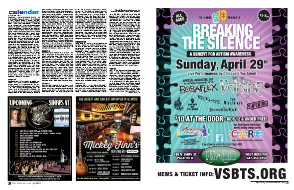 Generation 60’ s— Pheasant Run Mainstage, St. Charles; Peter & The Versatiles— Pheasant Run Resort, St. Charles; Espinosa & Coffey— Pig Minds Brewing Co., Machesney Park; Moon Money— Potter’ s Place, Naperville; Swan Song / School of Rock DuPage— Q Bar, Darien; Cowboy Jukebox— Q Bar, Glendale Heights; Nygel Ajax Band— Q Bar, Plano; Fastplants / Lynards Innards / The Spanish Flats / Geezers Senior— Quenchers, Chicago; Woodrock Ranger— Reefpoint Brew House, Racine, WI; Ruby The Hatchet / Youngblood Supercult( Music Joint)/ Two Legends & A Son / Chicago Jamaican Jaxx Ensemble / DJ Chuck Wren / Triton Soundsystem( Rock Club)— Reggie’ s, Chicago; Jackson Galaxy— Rialto Square Theater, Joliet; Julian Jumpin Perez / DJ Mark Lojo— Rivers Casino, Des Plaines; Rico McFarland Band— Rosa’ s Lounge, Chicago; Marco Benevento / Dogs At Large— Schubas, Chicago; Karma Committee— Sideouts, Island Lake; Material Reunion / Bear Who?/ Colette / Diz / J-Dub / Josh Werner / Miles Maeda / Scott Song— Smart Bar, Chicago; Sure Sure w / Brantwood / Geographer w / Joan— Space, Evanston; Anti-Lilly / Navarro / Jay Lyn Gatz / Boston Manor / Homesafe / Free Throw / Hot Mulligan / save face / Spanish Love Songs / How It Got Burned— Subterranean, Chicago; Poison’ d Crue / Done Dirt Cheap— Tailgater’ s, Bolingbrook; The Weepies / Gia Margaret— Thalia Hall, Chicago; Serendipity / Mallory Lennon— The Cottage, Crystal Lake; The Fred Durst Explosion / No Coastal / Succubus /# 1 Zero— The Forge, Joliet; Patio Daddy-O— The Gambler, McHenry; Black Coffee— The Mid, Chicago; DJ Esteban La Groue & Danny Dan— The Owl, Chicago; Average White Band— The Promontory, Chicago; The Wood Brothers / Nicki Bluhm— The Vic Theater, Chicago; Jukebox Junkys— Tilted Kilt, Bolingbrook; Spare Parts / Fareed Haque & The Funk Brothers— Tonic Room, Chicago; MyTyme— Tuscany, Oak Brook; The Comstock Lode— Twisted Rose, Algonquin; Kevin Hart— United Center, Chicago; Electric Brew / DJ & Karaoke w / Karaoke Zaach— Uptown Lounge, Chicago; Joystick— Uptown Tap, Plainfield; DJ Q— Venuti’ s, Addison; Do or Die— Wire, Berwyn; Sweet Diezel Jenkins— Wise Owl, Chicago; Boneless— Zach’ s On Tap, Palos Heights; Good Fellas— Zachary’ s Bar, Palos Heights.