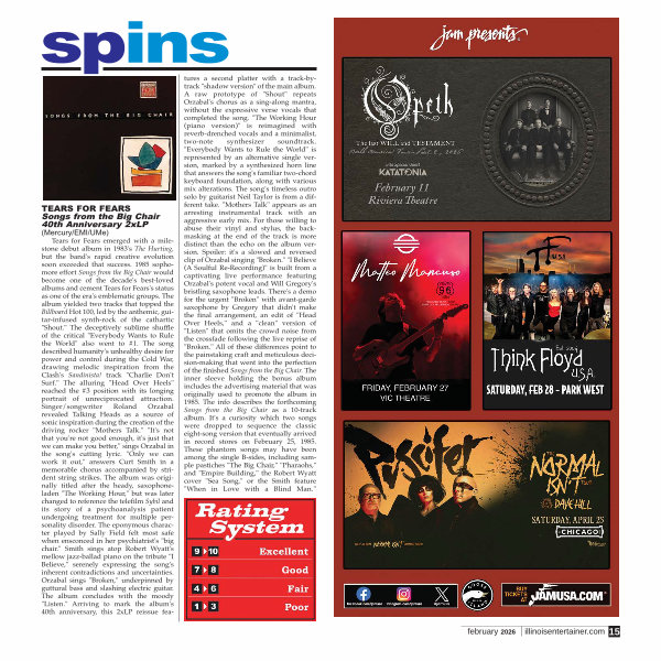 Tears for Fears emerged with a milestone debut album in 1983 ' s The Hurting, but the band ' s rapid creative evolution soon exceeded that success. 1985 sophomore effort Songs from the Big Chair would become one of the decade ' s best-loved albums and cement Tears for Fears ' s status as one of the era ' s emblematic groups. The album yielded two tracks that topped the Billboard Hot 100, led by the anthemic, guitar-infused synth-rock of the cathartic " Shout." The deceptively sublime shuffle of the critical " Everybody Wants to Rule the World " also went to # 1. The song described humanity ' s unhealthy desire for power and control during the Cold War, drawing melodic inspiration from the Clash ' s Sandinista! track " Charlie Don ' t Surf." The alluring " Head Over Heels " reached the # 3 position with its longing portrait of unreciprocated attraction. Singer / songwriter Roland Orzabal revealed Talking Heads as a source of sonic inspiration during the creation of the driving rocker " Mothers Talk." " It ' s not that you ' re not good enough, it ' s just that we can make you better," sings Orzabal in the song ' s cutting lyric. " Only we can work it out," answers Curt Smith in a memorable chorus accompanied by strident string strikes. The album was originally titled after the heady, saxophoneladen " The Working Hour," but was later changed to reference the telefilm Sybil and its story of a psychoanalysis patient undergoing treatment for multiple personality disorder. The eponymous character played by Sally Field felt most safe when ensconced in her psychiatrist ' s " big chair." Smith sings atop Robert Wyatt ' s mellow jazz-ballad piano on the tribute " I Believe," serenely expressing the song ' s inherent contradictions and uncertainties. Orzabal sings " Broken," underpinned by guttural bass and slashing electric guitar. The album concludes with the moody " Listen." Arriving to mark the album ' s 40th anniversary, this 2xLP reissue features a second platter with a track-bytrack " shadow version " of the main album. A raw prototype of " Shout " repeats Orzabal ' s chorus as a sing-along mantra, without the expressive verse vocals that completed the song. " The Working Hour( piano version)" is reimagined with reverb-drenched vocals and a minimalist, two-note synthesizer soundtrack. " Everybody Wants to Rule the World " is represented by an alternative single version, marked by a synthesized horn line that answers the song ' s familiar two-chord keyboard foundation, along with various mix alterations. The song ' s timeless outro solo by guitarist Neil Taylor is from a different take. " Mothers Talk " appears as an arresting instrumental track with an aggressive early mix. For those willing to abuse their vinyl and stylus, the backmasking at the end of the track is more distinct than the echo on the album version. Spoiler: it ' s a slowed and reversed clip of Orzabal singing " Broken." " I Believe( A Soulful Re-Recording)" is built from a captivating live performance featuring Orzabal ' s potent vocal and Will Gregory ' s bristling saxophone leads. There ' s a demo for the urgent " Broken " with avant-garde saxophone by Gregory that didn ' t make the final arrangement, an edit of " Head Over Heels," and a " clean " version of " Listen " that omits the crowd noise from the crossfade following the live reprise of " Broken." All of these differences point to the painstaking craft and meticulous decision-making that went into the perfection of the finished Songs from the Big Chair. The inner sleeve holding the bonus album includes the advertising material that was originally used to promote the album in 1985. The info describes the forthcoming Songs from the Big Chair as a 10-track album. It ' s a curiosity which two songs were dropped to sequence the classic eight-song version that eventually arrived in record stores on February 25, 1985. These phantom songs may have been among the single B-sides, including sample pastiches " The Big Chair," " Pharaohs," and " Empire Building," the Robert Wyatt cover " Sea Song," or the Smith feature " When in Love with a Blind Man." february 2026 illinoisentertainer. com 15