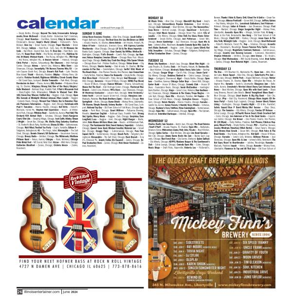 Charles Heath / Jam Session — Andy ' s Jazz , Chicago ; The Dead Daisies / Enuff Z ’ Nuff — Arcada Theatre , St . Charles ; Open Mic — Ballydoyle , Downers Grove ; Midcentury Llama / Holy Joke / B . Lake — Beat Kitchen , Chicago ; Splice Series — Beat Kitchen , Chicago ; Live Band Karaoke — Bub City , Chicago ; Jimmy Burns Hosts the Jam — Buddy Guy ' s Legends , Chicago ; Run Forest Run — City Centre , Elmhurst ; Quinn Sullivan — City Winery , Chicago ; KOPPS / Madame Reaper & The Gentlement ' s Club — Cobra Lounge , Chicago ; Comedy Open Mic — Coles , Chicago ; Music Bingo — Draft Picks , Naperville ; Roberta Lea — FitzGerald ' s ,