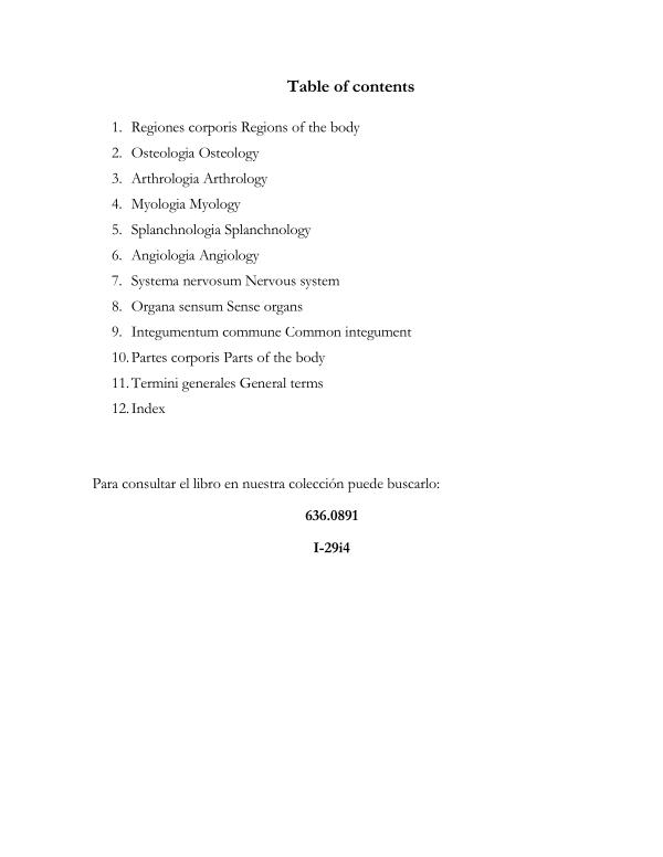 1 . Regiones corporis Regions of the body 2 . Osteologia Osteology 3 . Arthrologia Arthrology 4 . Myologia Myology 5 . Splanchnologia Splanchnology 6 . Angiologia Angiology 7 . Systema nervosum Nervous system 8 . Organa sensum Sense organs 9 . Integumentum commune Common integument 10 . Partes corporis Parts of the body 11 . Termini generales General terms 12 . Index