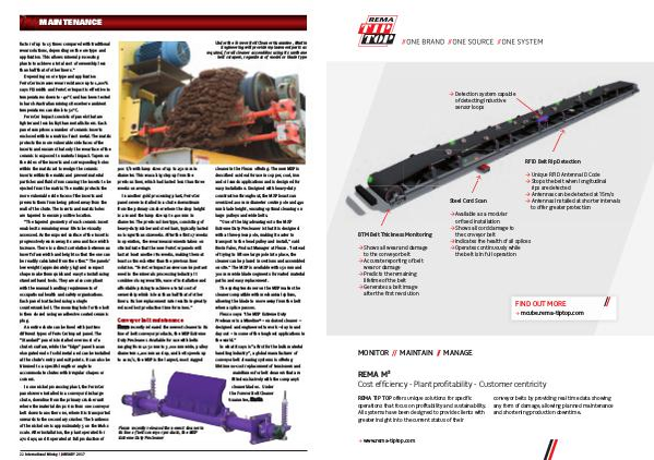 REMA TIP TOP offers unique solutions for specific operations that focus on profitability and sustainability. All systems have been designed to provide clients with greater insight into the current status of their conveyor belts by providing real time data showing any form of damage, allowing planned maintenance and shortening production downtime. à www. rema-tiptop. com