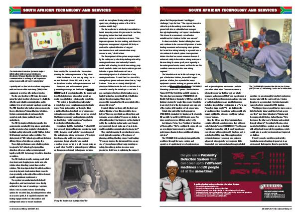 De Beer concludes:‘ Reutech Mining has been and continues to be a successful provider of worldleading movement and surveying radar systems for the surface mining industry in 24 countries on six continents. Reutech systems have provided information that has saved numerous lives and enhanced safety in the surface mining workspace. We now bring the same quality and ingenuity to the underground environment, and look forward to contribute even more to this new mining segment.”