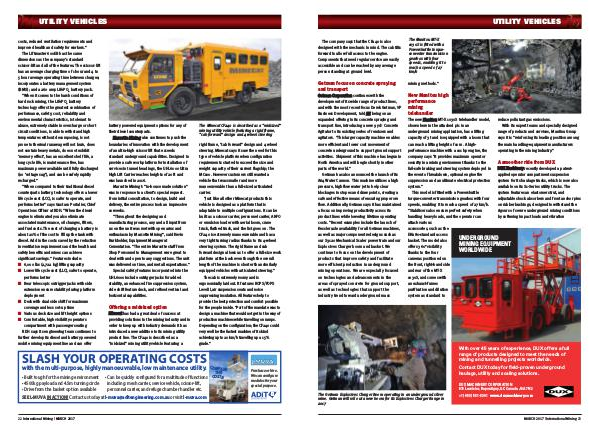 DUX Machinery recently developed a patentapplied operator compartment suspension system for its haulage trucks, which is now also available on its S1-Series utility trucks. The system features an elastomer strut, and adjustable shock absorbers and front anchor pins on rubber bushings, designed to withstand the rigours of severe underground mining conditions by softening impact loads and vibration