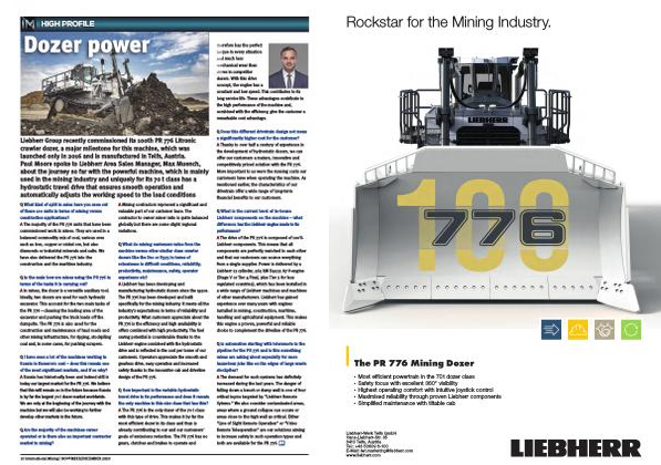 Liebherr Group recently commissioned its 100th PR 776 Litronic crawler dozer , a major milestone for this machine , which was launched only in 2016 and is manufactured in Telfs , Austria . Paul Moore spoke to Liebherr Area Sales Manager , Max Muench , about the journey so far with the powerful machine , which is mainly used in the mining industry and uniquely for its 70 t class has a hydrostatic travel drive that ensures smooth operation and automatically adjusts the working speed to the load conditions
