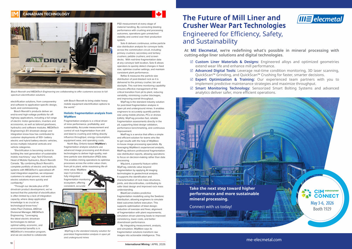 North Bay, Ontario-based WipWare’ s fragmentation analysis solutions use advanced image processing and AI-driven technologies to deliver high-quality, realtime particle size distribution( PSD) data. This enables mining operations to optimise processes across the entire value chain, from pit to plant, while maximising life-ofmine value. WipWare says it provides a fully integrated fragmentation monitoring ecosystem, offering consistent, accurate