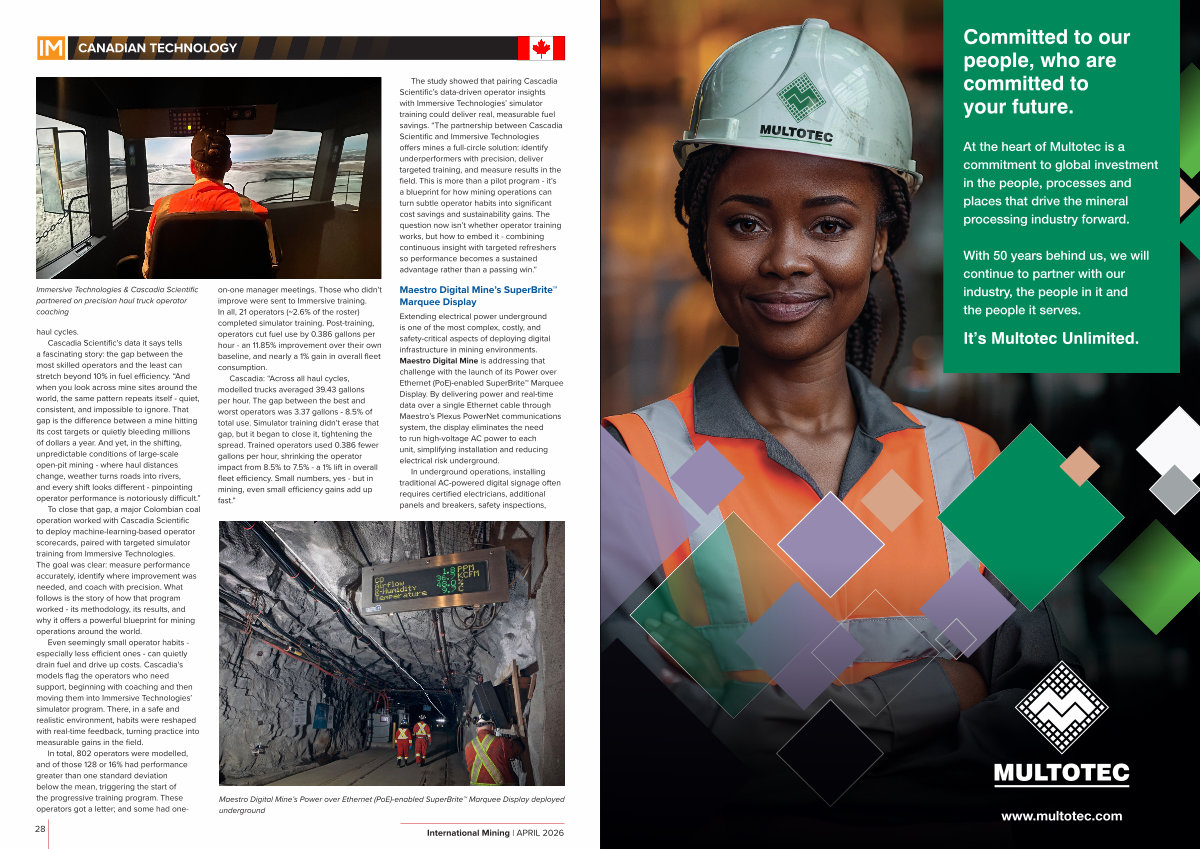 The study showed that pairing Cascadia Scientific’ s data-driven operator insights with Immersive Technologies’ simulator training could deliver real, measurable fuel savings.“ The partnership between Cascadia Scientific and Immersive Technologies offers mines a full-circle solution: identify underperformers with precision, deliver targeted training, and measure results in the field. This is more than a pilot program- it’ s a blueprint for how mining operations can turn subtle operator habits into significant cost savings and sustainability gains. The question now isn’ t whether operator training works, but how to embed it- combining continuous insight with targeted refreshers so performance becomes a sustained advantage rather than a passing win.”