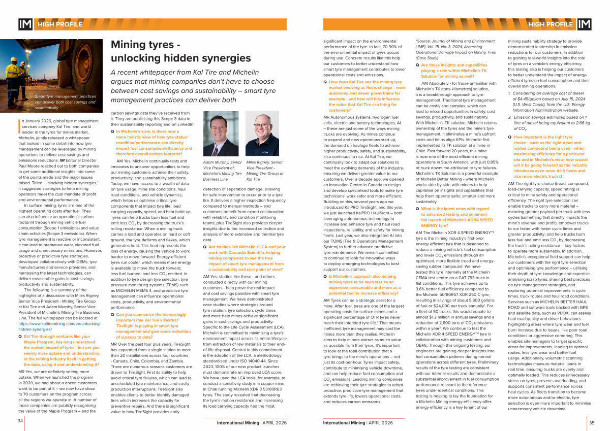 The following is a summary of the highlights of a discussion with Miles Rigney, Senior Vice President- Mining Tire Group at Kal Tire and Adam Murphy, Senior Vice President of Michelin’ s Mining Tire Business Line. The full whitepaper can be located at https:// www. kaltiremining. com / en / unlockinghidden-synergies /