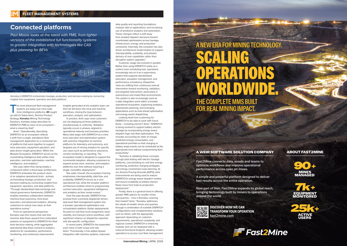 Finally, there is a general trend in offering greater FMS options for smaller mines and quarries – how is Komatsu covering that market? Amin:“ Komatsu addresses the needs of smaller mines and quarries through a combination of scalable DISPATCH configurations and complementary solutions such as iVolve, with the appropriate approach depending on customer requirements, operational complexity, and regional context. DISPATCH is inherently modular and can be deployed with a reduced functional footprint, allowing smaller operations to access core fleet management