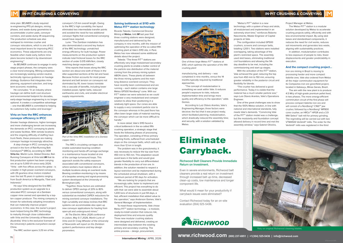 A step-change in IPCC conveying has arrived in the form of Rail-Running Belt Conveyors TM( RRCs), according to OEM Virta Inc. Martin Lurie, Global Director, Rail- Running Conveyors at Virta told IM that its first production system has been carrying ore at up to 5,000 t / h since early 2026.“ Virta- with five offices across the globe- is a leader in high-power overland conveyors, with 29 gearless drive motors installed over the last 15 years in systems ranging from South America to Mongolia, Tibet and Indonesia.”
