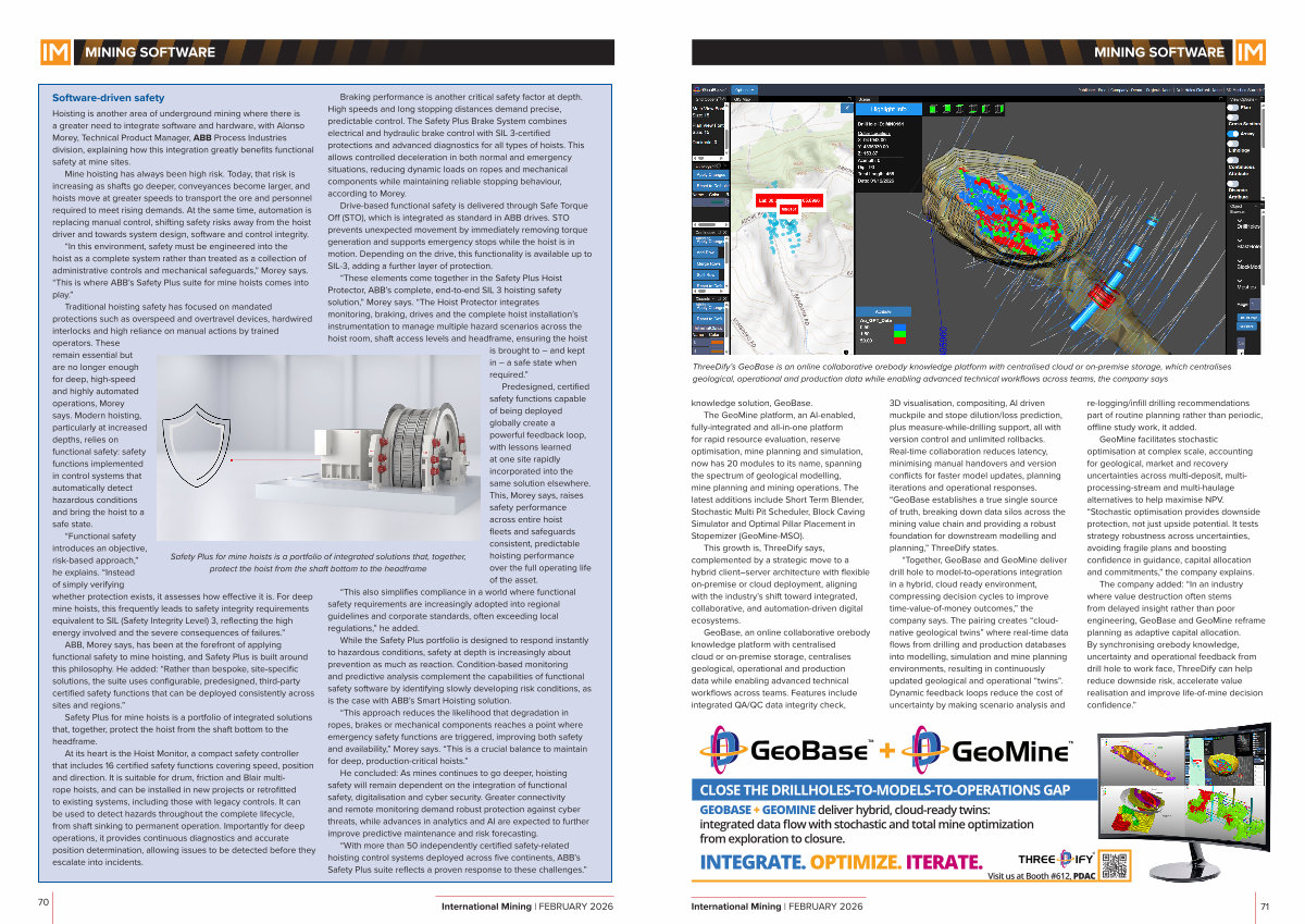 ABB, Morey says, has been at the forefront of applying functional safety to mine hoisting, and Safety Plus is built around this philosophy. He added:“ Rather than bespoke, site-specific solutions, the suite uses configurable, predesigned, third-party certified safety functions that can be deployed consistently across sites and regions.”