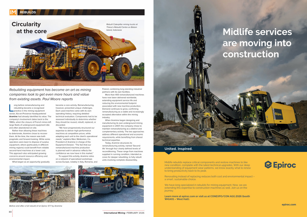 Long before remanufacturing and rebuilding became a recognised practice in the mining equipment sector, Aix-en-Provence headquartered Aramine had already identified its value. The company’ s involvement dates back to the 1980s, when the closure of French mines left large fleets of underground equipment idle and often abandoned on site.