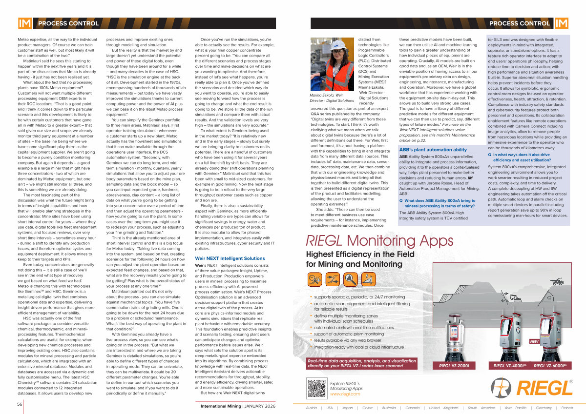 Weir’ s NEXT intelligent solutions consists of three value packages: Insight, Uptime, and Production. Production empowers users in mineral processing to maximise process efficiency with AI-powered process optimisation. Weir’ s NEXT Process Optimisation solution is an advanced decision-support platform that creates a true digital twin of the process. At its core are physics-informed models and dynamic simulations that replicate real plant behaviour with remarkable accuracy. This foundation enables predictive insights and scenario testing, ensuring plant users can anticipate changes and optimise performance before issues arise. Weir says what sets the solution apart is its deep metallurgical expertise embedded into its algorithms. By combining process knowledge with real-time data, the NEXT Intelligent Assistant delivers actionable recommendations for throughput, stability, and energy efficiency, driving smarter, safer, and more sustainable operations. But how are Weir NEXT digital twins