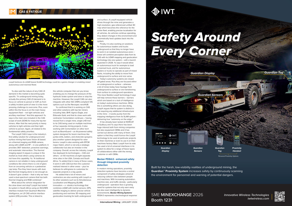 Finally, it is also working on solutions for autonomous loaders and trucks underground so that they no longer have to work in an isolated autonomous zone – these will combine perception data from its CAS with its LiDAR mapping and geolocation technology into one system – with a launch expected in 2026. Yu says it would allow an autonomous truck for example to load a manned truck, and for autonomous loaders or trucks to operate as part of mixed fleets, including the ability to move from underground to surface and vice versa.