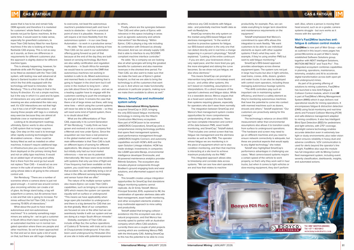 As part of its growing offering of solutions to mining customers, Fast2Mine has launched a new Anti-Fatigue & Collision Control module, which it told IM is part of Fast2Mine’ s Mining Management System( MMS) which it says delivers real operational results for mining operations. It encompasses fatigue & distraction detection( DMS) using facial monitoring and real-time alerts and Forward Collision Warning( FCW) and safe-distance management adapted to mining conditions. It also has Intelligent Blind Spot Detection( BSD) for pedestrians and light vehicles, with 270 ° coverage. Blacklight camera technology enables accurate detection even in extremely lowlight or dusty environments; plus radar-vision fusion ensures reliability in heavy dust and adverse conditions. V2V communication is used for alerts beyond the operator’ s line of sight. FastMine also says the module has full integration with its Mining Control fleet management system, including event severity classification, dashboards, insights, and automated actions. International Mining | JANUARY 2026 81