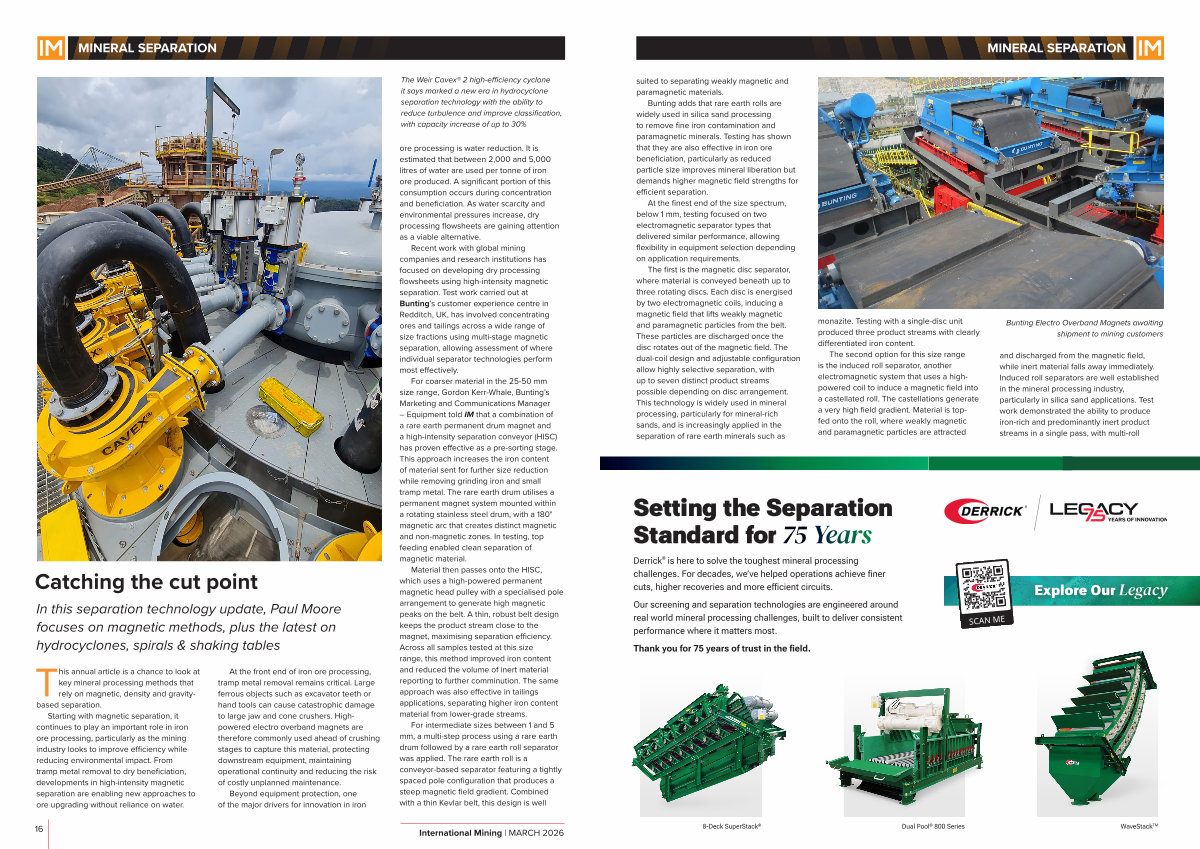 Bunting adds that rare earth rolls are widely used in silica sand processing to remove fine iron contamination and paramagnetic minerals. Testing has shown that they are also effective in iron ore beneficiation, particularly as reduced particle size improves mineral liberation but demands higher magnetic field strengths for efficient separation.